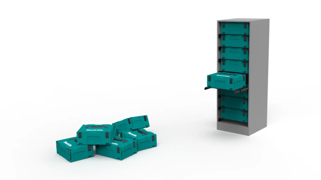 Der große Vorteil besteht darin, dass jede Makita Makpac einzeln herausgezogen werden kann – egal, ob sie ganz oben oder unten steht. Und das Beste daran ist, dass du die Box nicht einmal herausheben musst, sondern sie direkt im Auszug öffnen kannst. Somit sparst du Zeit, Platz und Nerven.